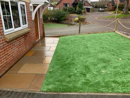 For a low-maintenance yet put-together front garden, artificial grass is the best option. Paired with sandstone paving for a hint of colour and warmth, a design like the one you see above is ideal for a cosy, stress free front garden. We have a range of artificial grasses to fit any decorative needs.
