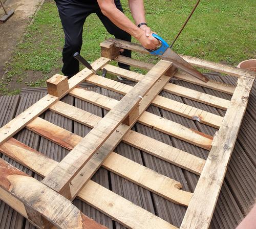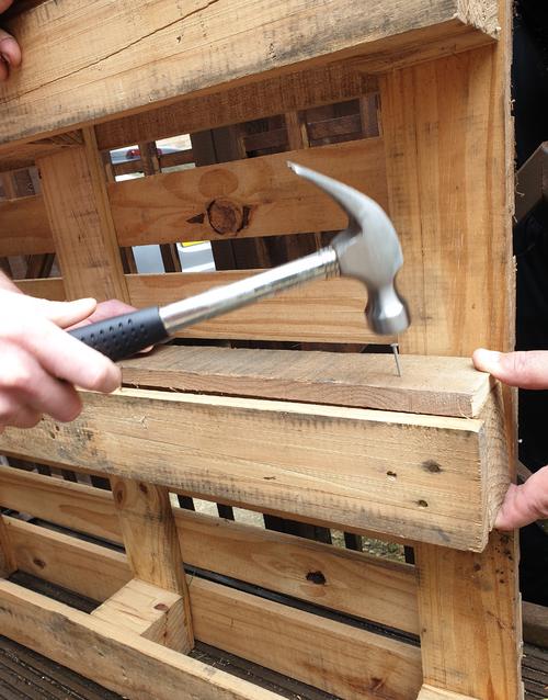 Carefully hammer the nails in, making sure each base panel is firmly attached to all three supporting sections of the pallet. In this example, six nails were used per section to ensure a strong, stable fit.