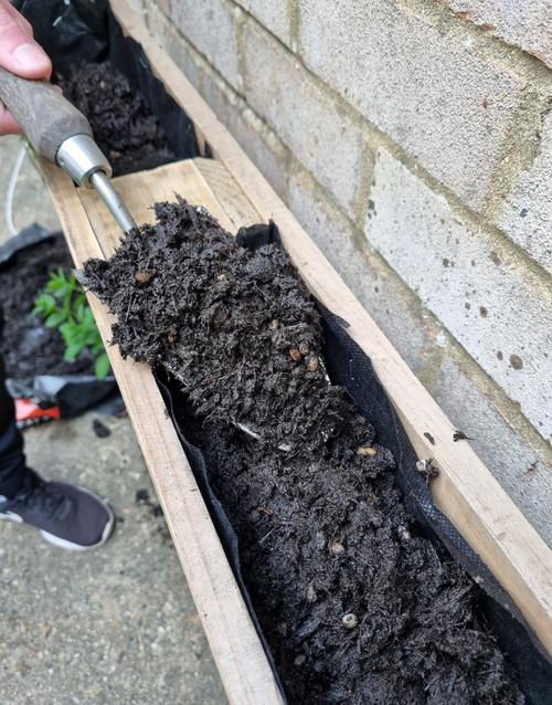 Now for the most rewarding step—planting your herbs! Before placing each one, check their sunlight preferences. Herbs that thrive in full sun should be planted near the top of the pallet, while those that prefer partial shade are best positioned lower down. Once planted, top up each compartment with a bit of extra soil to help your herbs settle in and establish strong roots.