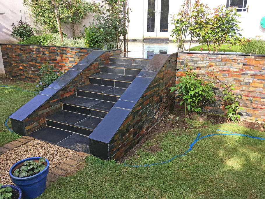 This is an important factor. If you have a garden that has mounds or slopes down, you might want to either remove the mounds by digging them up and taking advantage of our Jumbo bag away or muck away service or you might want to incorporate different levels into your garden. If your garden slopes down, you could create different levels of decking or patio with steps in between, leading to a turfed area of garden. Our ledger stone walling is popular for creating two different levels as it creates a beautiful finish to any walling which is used for different levels (see photo below).