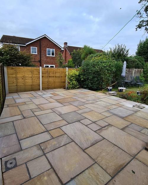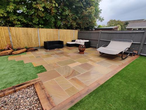 These talented landscapers have used our Buff Blend Sandstone Paving to create this warm and inviting patio.