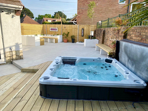 A fairly understated garden which has been brought to life with surroundings such as their dining area, hot tub and chimnea. But what we love the most is what's sat underneath these items; a stunning, modern patio.