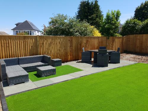 The products that have been used are our Aqua Limestone Paving slabs for a dining area as well as to join each area together. This had then been complete with Charcoal edging for a smart finish. Our Oak Sleepers have created the surrounds for the play area and plant borders and our Certified Play Chip has been used within the play area for soft landings. This has then been finished off with Artificial Grass.
