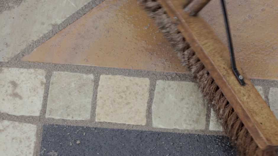 Step 5 – As you are watering the compound, simultaneously begin sweeping the compound into the joints. Be fast and rigorous when doing this because you want to push them into the joints before they get dry. It is best to work with a 2nd person so one person can brush the compound into the joints while the other is pouring water on the paving when needed.
