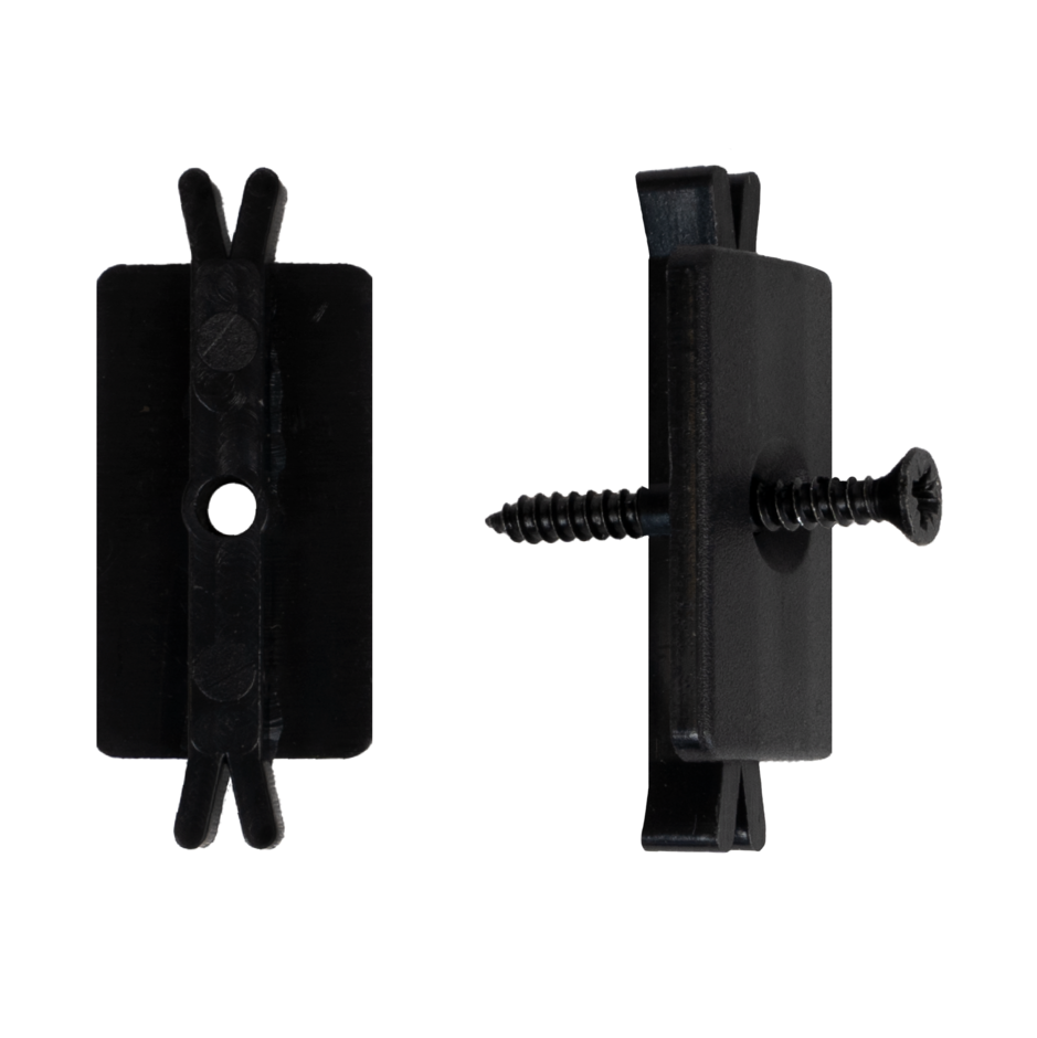 This set of plastic clip and screw are essential in the installation of DuoDeck Boards. These are cleverly designed to be laid inbetween the boards, giving the perfect gap as well as hiding the fixing.